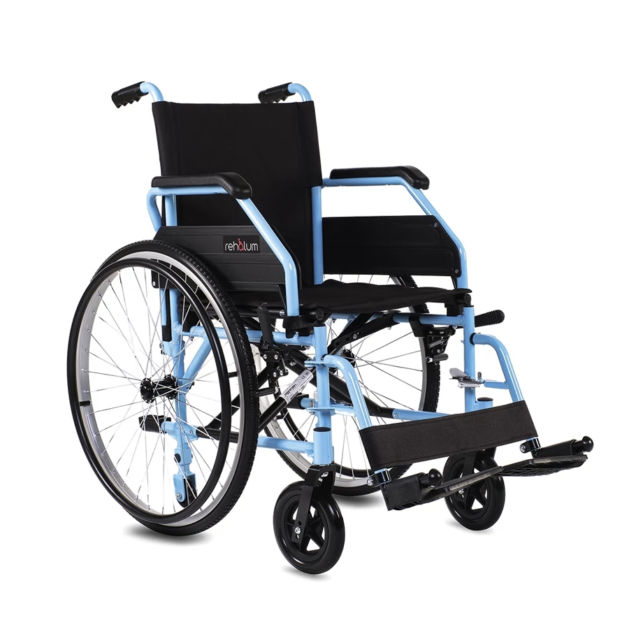 Duplarugós keresztvázzal és gyorskioldós 24″ hátsó kerekekkel rendelkezik – opcionálisan választható 12″-es hátsó kerék is –, mindkettő teljesen tömör PU abronccsal. A karfák fél-asztallapos (semi-desk), felhajthatók, míg a lábtartók kivehetők és magasságban állíthatók. A nylon üléspárna tűzálló betéttel szerelt, hátsó tárolózsebbel és biztonsági övvel rendelkezik. Az első kerékvilla szintén alumíniumból készült.
